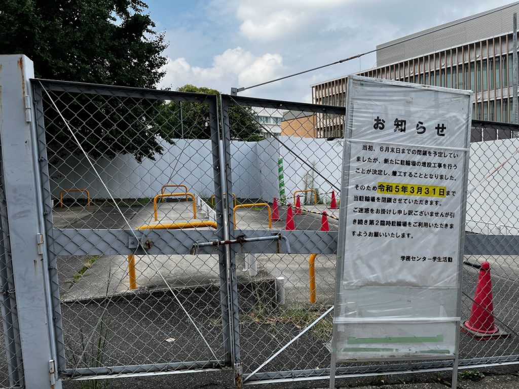 最近、名城大学の天白キャンパスはいつも必ずどこかで工事してますね。リニューアルが進んでいて、羨ましいです。ただ問題なのは、工事のせいで西側の駐輪場が閉鎖されていることです。