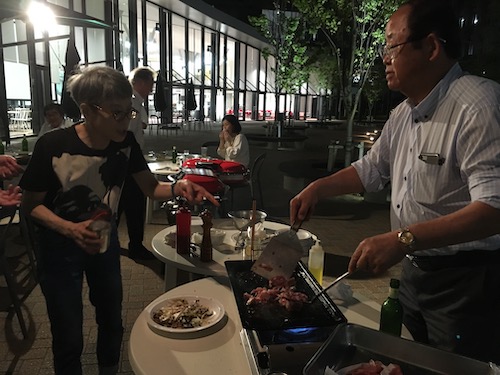 会場は、ナゴヤドーム前キャンパス内のレストラン、MUガーデンテラスです。バーベキューの用意をしていただけました。学生にも良さそうです。一般の利用も歓迎です。大学構内でぜひバーベキューを(?)。