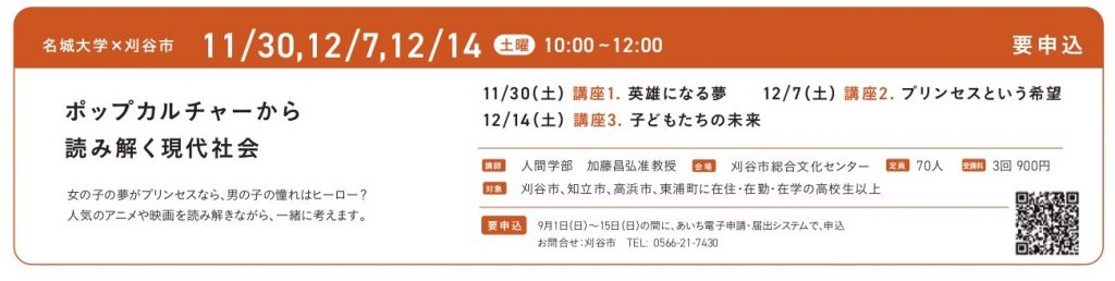 愛知県刈谷市で「ポップカルチャーから読み解く現代社会」と題した市民講座を担当します。全3回で、人間学部の「国際文化論」で講義するような物語分析に関する内容を、映画やアニメを事例に、わかりやすくお話しします。