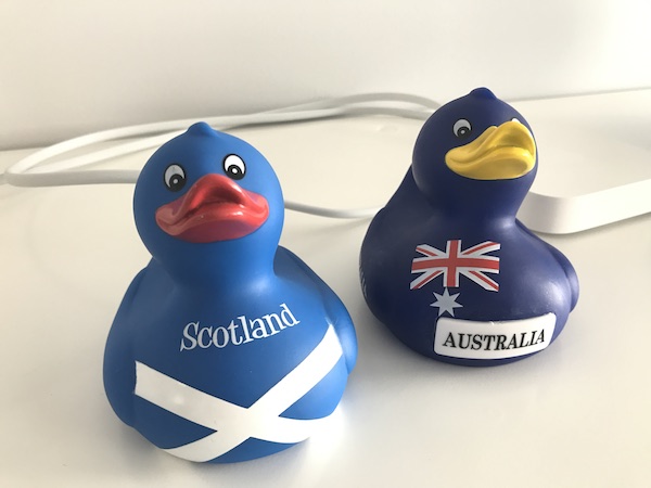 写真で紹介、右側のオーストラリア・アヒルは2月から3月にかけて、人間学部の海外研修でオーストラリアのブリスベンに留学をした学生からいただいたものです(ありがとうございます!)。私の研究室にスコットランドのアヒル(写真左)が前からいましたので、そのお友達をオーストラリア見つけた、とのことです。