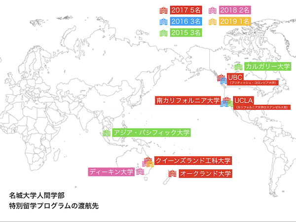 上の地図は、2015〜2019年の実績です。特別留学は、他の海外研修と異なります。教員のサポートのもとで単身で準備をした上で、単身で渡航・留学します。出発前の入学手続きなどでも英語力を養うことができます。しかも、留学中の単位を認定するので、名城大学を4年間で卒業可能です。