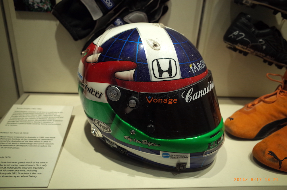 上のヘルメットは、スコットランド出身で、アメリカで活躍したダリオ・フランキッティ選手のグッズです。スコットランドの誇りとして展示されていたと考えられます。他にも多くのスコットランド人選手のグッズが展示されていて、その多くにはスコットランドの国旗がデザインとして組みこまれていました。