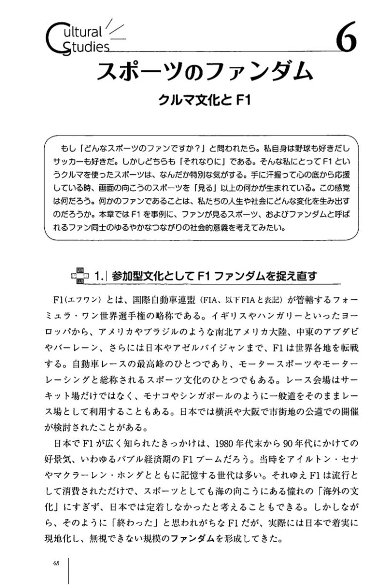 →『ゆさぶるカルチュラル・スタディーズ』収録の「スポーツのファンダム クルマ文化とF1」にて、お願いします。